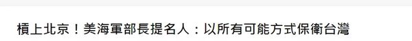 又是“专门对付”,又是“绝对支持”,这位候任海军部长的姿态毫不意外地赢得了岛内一些媒体和人士的欢心。岛内绿媒如《自由时报》,用“杠上北京”“绝对挺台”的标题大写加粗来为自己打气壮胆。