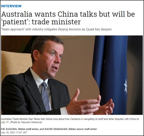 昨天(17日),澳贸易部长丹·特汉(Dan Tehan)接受《日本经济新闻》专访,称澳大利亚希望通过和中国对话,解决争议,但是会“保持耐心”。距离上次他向中国“求对话”才过去两个月,为了劝中国改变想法,这次他又找个新角度,称中澳贸易关系“正帮数百万中国人摆脱贫困”……