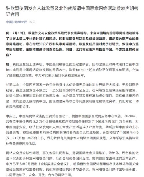 驻欧盟使团发言人就欧盟及北约就所谓中国恶意网络活动发表声明答记者问