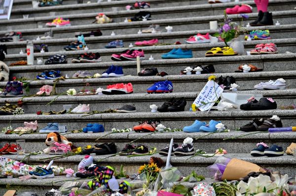 ▲5月30日,在加拿大温哥华,人们摆放鲜花、鞋子等物品,悼念不列颠哥伦比亚省坎卢普斯市一所原住民寄宿学校的死者。(新华社)
