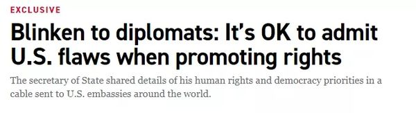最近,美国似乎准备“讲一点理”了。美国《政治报》网站报道称,美国国务卿布林肯对美国在全球各地的外交官们发出指示,要他们勇于承认美国在人权领域的缺陷,并说这是“OK”的。