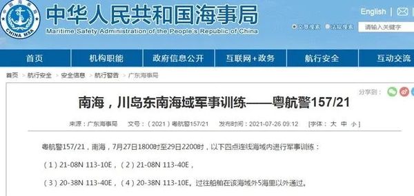 由广东海事局于7月26日上午发布的航行警告来看,在7月27日18点至7月29日22点,在四点连线海域内进行军事训练,过往船舶被要求在该海域外5海里以外通过。