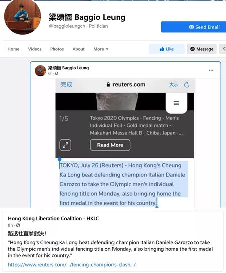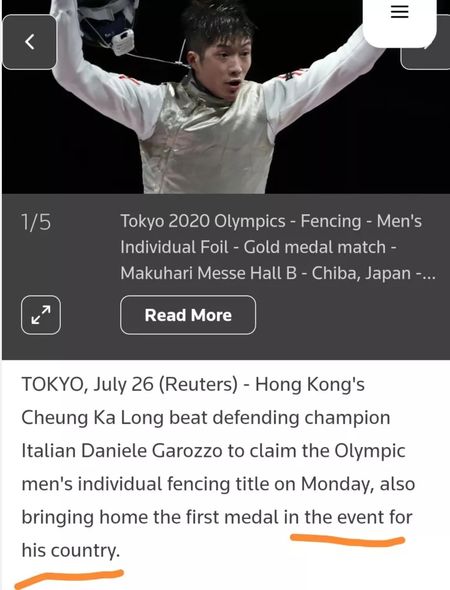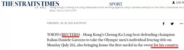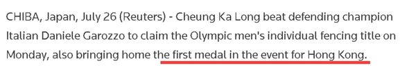 在我们中国香港特区运动员张家朗,于7月26日斩获东京奥运会男子花剑项目的金牌后,英国路透社也刊文报道了此事。