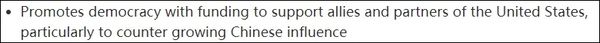 而众议院新闻稿在罗列了“对外援助”、“应对气候变化”等法案意图后,毫不掩饰地称要“通过拨款促进‘民主’,支持美国的盟友和伙伴,特别是对抗中国日益增长的影响力”。