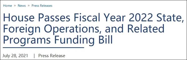 据美国众议院网站7月28日消息,众议院当天以217票赞成、212票反对,通过了“2022财年国务院、对外事务及相关计划拨款法案”,旨在为美国的外交、发展和外交政策机构及项目提供资金,其中包括国务院、美国国际开发署和美国驻联合国使团。根据众议院通过的版本,该法案将为此拨款622.4亿美元,比2021年增加67.37亿美元。