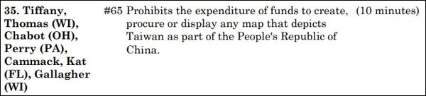 除此以外,一项获得口头表决通过的修正案显示,共和党籍众议员汤姆·蒂法尼(Tom Tiffany)等5名议员竟公然违背一个中国原则,提议规定该法案所提供的资金不得用于制作、获取或展示任何“将台湾描绘为中华人民共和国领土一部分”的地图。