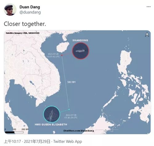 美国“动力”网站“战区”专栏7月29日报道称,一张最新曝光的卫星图显示,英国“伊丽莎白女王”号航母编队正在南海,而解放军的航母山东舰也在同一海域活动。