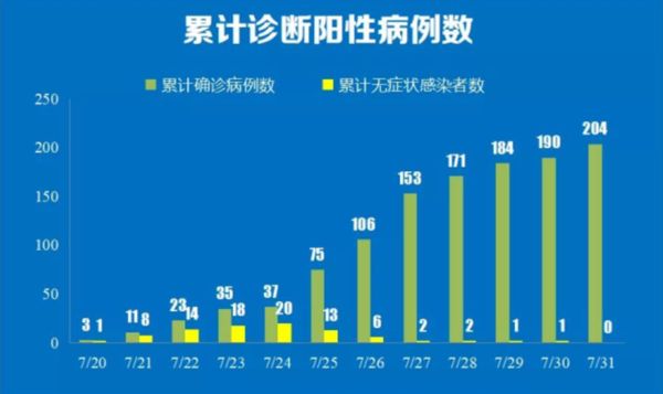 据江苏省卫健委8月1日发布的信息,7月31日0至24时,南京市报告新增本土确诊病例14例,其中1例为无症状感染者转为确诊病例。7月20日至今,南京市已累计报告本土确诊病例204例。