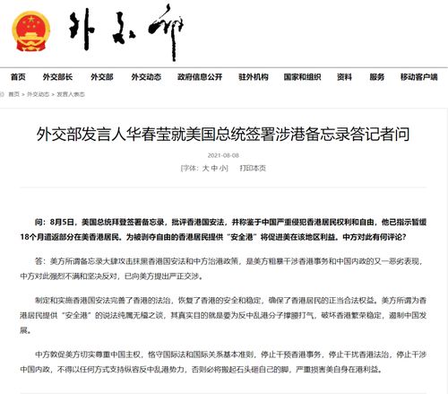 美国总统签署涉港备忘录 外交部:坚决反对,已向美方提出严正交涉 问:8月5日,美国总统拜登签署备忘录,批评香港国安法,并称鉴于中国严重侵犯香港居民权利和自由,他已指示暂缓18个月遣返部分在美香港居民。……