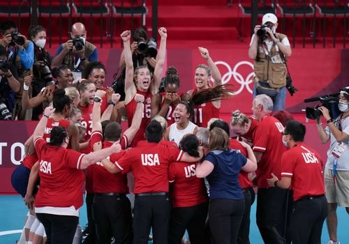 ▲8月8日,美国女排庆祝胜利。新华社记者朱峥摄