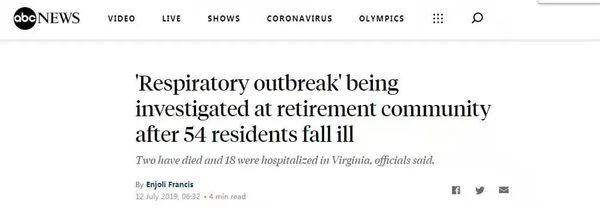 △据美国广播公司(ABC)2019年7月12日报道,弗吉尼亚州北部一社区有54人出现发烧、咳嗽和全身无力等症状,2人死亡;该社区距德特里克堡生物实验室仅1小时车程。