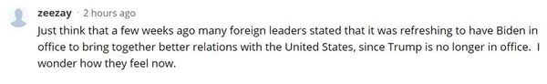还有网友讽刺说,“想想看,不久之前,许多外国领导人还表示,特朗普卸任,拜登的上任振奋人心,有助于改善其与美国的关系,不知道他们现在是什么感觉呢。”↓