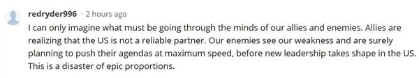“我只能想象我们的盟友和敌人的脑子都正在想些什么。盟友们正意识到,美国不是一个可靠的伙伴,我们的敌人则看到了我们的弱点,肯定正计划在美国新领导层形成之前,全速推进其日程。这是一场史无前例的灾难。”