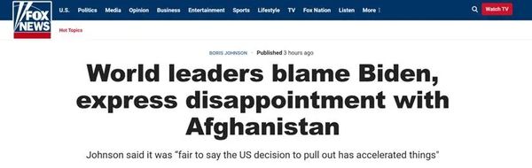 “多国领导人责怪拜登,流露对阿富汗局势的失望”,美国福克斯新闻15日以此为题报道称,在阿富汗局势突然变天后,世界多国领导人纷纷表达了对阿富汗局势的失望之意,英国首相约翰逊还将责任推到了拜登和美国身上。