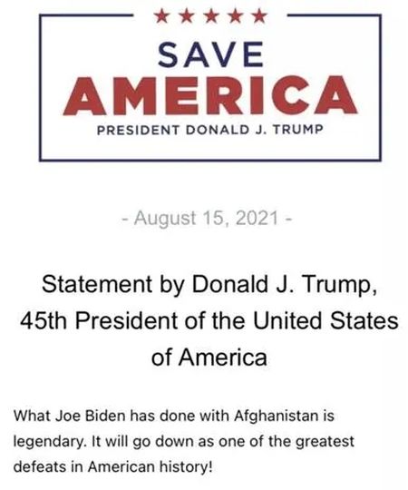 特朗普当地时间15日在一份声明中讽刺写道,“乔·拜登对阿富汗的所作所为堪称‘传奇’,这将成为美国历史上最大的失败之一!”他还在另一份声明中喊话说,“是时候让乔·拜登不光彩地辞职了,不光是因为他允许在阿富汗发生这样的事,还有新冠病例激增、边境灾难、能源独立遭到破坏,以及我们的经济陷入灾难。”