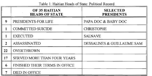 有美国学者在1995年撰文统计了海地历史上35名国家领导人的命运,发现其中仅6人平安完成了自己的任期,而被推翻的则多达22人,还有2人被刺杀,1人自杀,1人被处决,死在任上的则有7人。