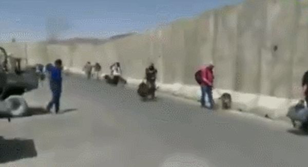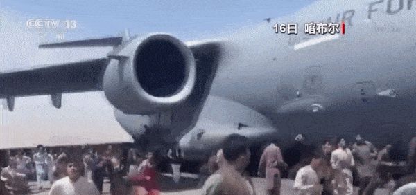 美军撤离阿富汗时牵着军犬登上飞机,而想要逃离的阿富汗人只能紧紧抓住离开的飞机