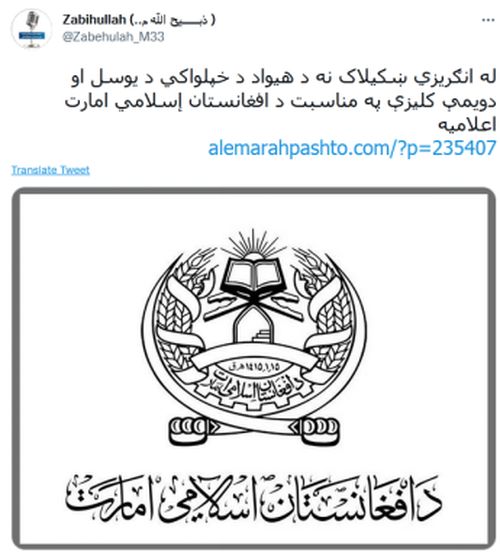 RT援引塔利班发言人扎比乌拉·穆贾希德的推特(未加V)消息称,塔利班宣布成立一个新的国家——“阿富汗伊斯兰酋长国”。穆贾希德在推文下还配了新的“国旗”样式。↓
