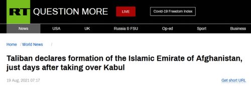 塔利班在阿富汗独立日宣布建国,公布“国旗”样式。据“今日俄罗斯”(RT)报道,塔利班19日宣布成立“阿富汗伊斯兰酋长国”并公布“国旗”样式。RT报道截图RT援引塔利班发言人扎比乌拉·穆贾希德的推特(未加V)消息称,……