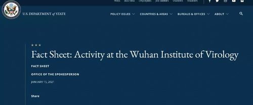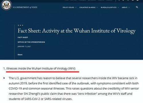比如在今年1月15日时,时任特朗普政府国务卿的蓬佩奥,就在美国国务院的官网上发布了一份指控武汉病毒所与新冠病毒来源有关的文档,其中抛出了如今正在被美国《华尔街日报》等美国主流媒体广泛引用的那些污蔑武汉病毒所的“证据”,比如宣称说武汉病毒所在新冠疫情爆发前有三人生病,以及污蔑石正丽研究蝙蝠冠状病毒是在制造新冠病毒等等。