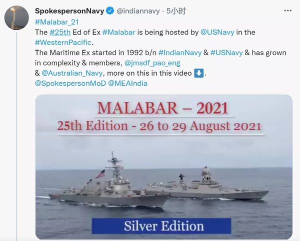 印度海军发言人推特发文炒作2021年“马拉巴尔”联合军演
