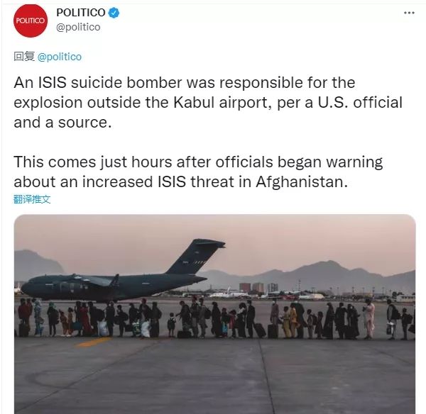 美国“政客”网站报道,美国官员称,一名IS自杀式爆炸者需要为喀布尔机场外的爆炸负责。