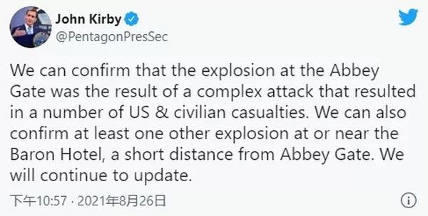 他在推特上写道:“我们可以确认,艾比门的爆炸事件是一次复杂袭击造成的结果,这次袭击造成了美国人和一些平民伤亡。我们还可以证实,至少还有一起爆炸事件发生在距离艾比门不远的巴隆酒店或巴隆酒店附近。我们会持续更新。”