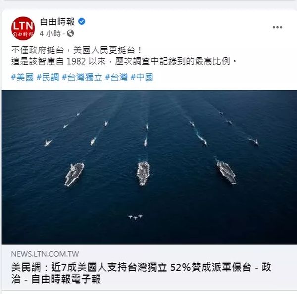 一份来自美国的民调让台湾绿媒今天有点嗨,自由时报甚至在脸书上发出了“不仅政府挺台,美国人民更挺台”的感慨。