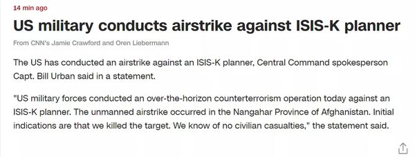 美国中央司令部发言人比尔·厄本上校(Capt. Bill Urban)在一份声明中表示:“今天,美军针对ISIS-K策划者已发动一项超视距反恐行动。本次无人机空袭发生在阿富汗的楠格哈尔省。最初迹象是我们杀死了目标,无平民受伤。”