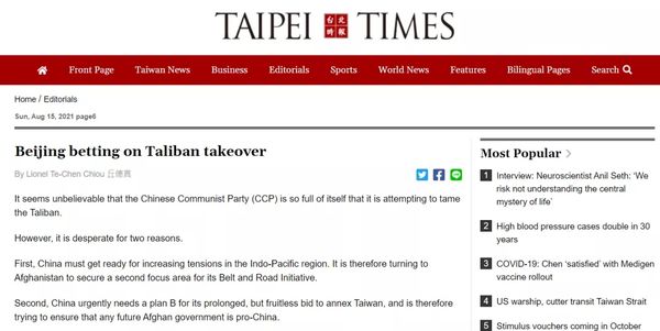 无独有偶,8月15日,台湾一篇媒体文章也提到了“唐朝和阿富汗”这个话题,和上一篇作者的意思一样,台媒这篇文章也企图把中国塑造成“想对阿富汗趁虚而入”的形象。但和上文直接把唐朝等同于当今中国这种说法截然相反的是,这个台媒的作者则拼命要在阿富汗问题上,撇清唐朝和当今中国的关系。