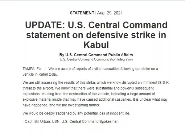 美军中央司令部把在喀布尔发动的空袭称为“防御性”行动,在推特上发布了“得知有报道称袭击造成平民伤亡”的声明。
