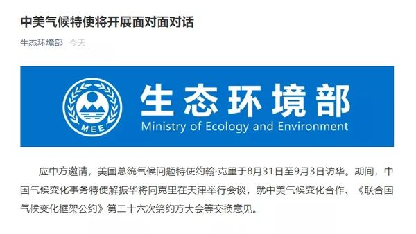 据“生态环境部”消息,应中方邀请,美国总统气候问题特使约翰·克里于8月31日至9月3日访华。其间,中国气候变化事务特使解振华将同克里在天津举行会谈,就中美气候变化合作、《联合国气候变化框架公约》第二十六次缔约方大会等交换意见。