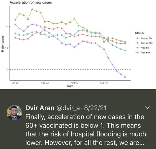 ▎以色列60岁以上接种第三针的人群中,R值已经降到1以下,说明感染的势头被控制住了(数据来自以色列理工学院Assistant Professor Dvir Aran推特账号)