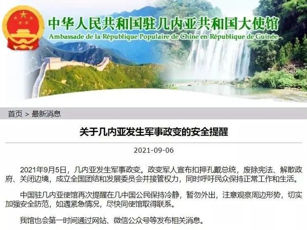 驻几内亚使馆:中国在几机构和人员情况总体稳定,暂未受波及