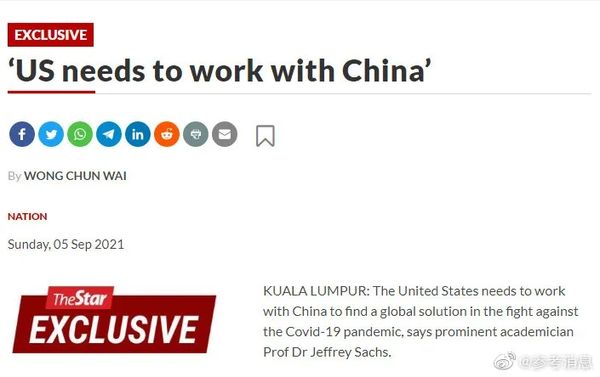 9月5日,国际医学期刊《柳叶刀》杂志新冠委员会主席、美国经济学家杰弗里·萨克斯在接受马来西亚《星报》独家专访时表示,“美国需要与中国合作,以找到抗击新冠大流行的全球解决方案。”(The United States needs to work with China to find a global solution in the fight against the Covid-19 pandemic)