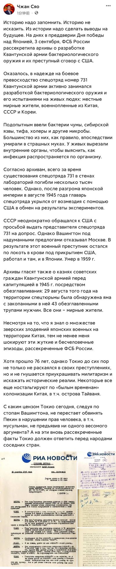 2021年9月6日,中国驻哈萨克斯坦大使张霄发脸书、推特等,介绍日前俄罗斯解密侵华日军暴行有关档案。