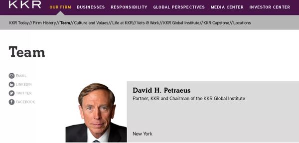 3、 在艾伦之后在阿富汗任美军指挥官的美军四星将军戴维·彼得雷乌斯(David Petraeus),如今已经加入了美国知名的私募投资公司KKR,担任合伙人和KKR全球学会的主席。值得一提的是,彼得雷乌斯曾陷入性丑闻,将机密文件违规交给了自己的情人。彼得雷乌斯本人则表示他是因为自己之前在军队和中情局的资历才被聘请的,并称自己不后悔在阿富汗的经历。