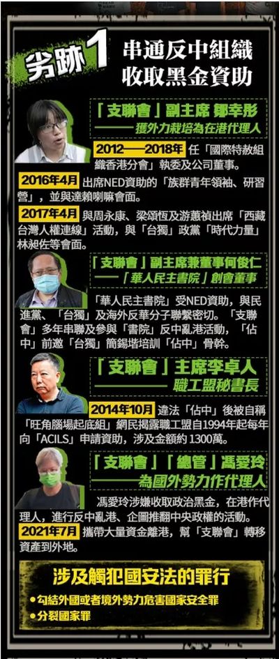 “支联会”头目都与外国势力有着千丝万缕的关系,不但长期接受美国资助、为其站台,更与海外反华分子有勾结,更多次公然鼓动外国干预香港、制裁中国。