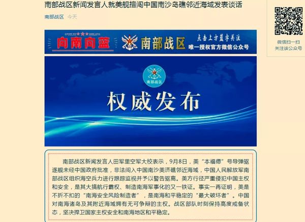 9月8日,美军“本福德”号导弹驱逐舰未经中国政府批准,非法闯入中国南沙美济礁邻近海域,