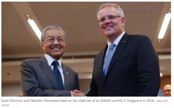 莫里森和马哈蒂尔在 2018 年新加坡东盟峰会期间会面(报道截图)