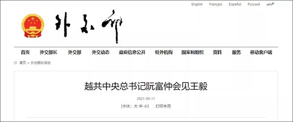 外交部网站消息,9月11日,越共中央总书记阮富仲在河内会见对越南进行正式访问的国务委员兼外长王毅,阮富仲表示,面对国际形势复杂变化,双方要携手并肩,克服困难,实现各自的社会主义建设目标,谁也无法动摇和改变越中之间的团结合作。