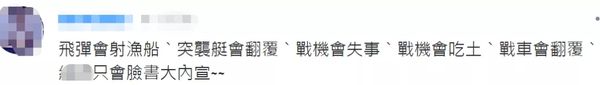 还有人讽刺蔡英文:导弹会射渔船、突袭艇会翻覆、战机会失事、战机会吃土、战车会翻覆、蔡英文只会脸书大内宣。↓