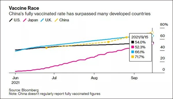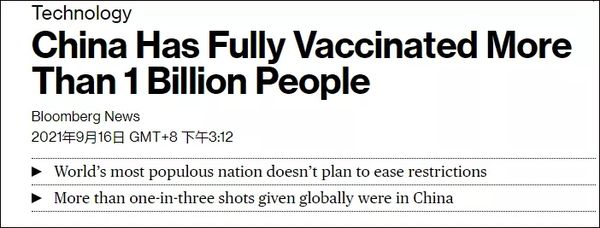 “中国已经为超过10亿人接种了疫苗!”在醒目的标题下,彭博社报道称,超70%的疫苗接种率和接种速度,使中国在世界最大经济体中处于领先地位。