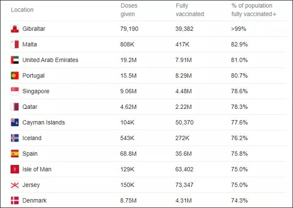 根据“从数据看世界”统计数据,除中国外,一些人口较少的国家的疫苗接种率同样超过70%。但观察者网注意到,这些本应已达到群体免疫的国家,如丹麦、葡萄牙、新加坡,每日确诊病例仍维持在三位数。