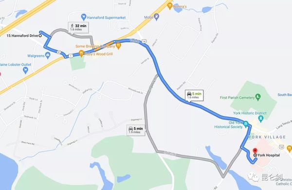 地图显示,美国缅因州约克县医院距离海贝公司不到1.6英里(2.6公里)