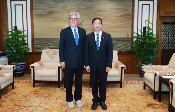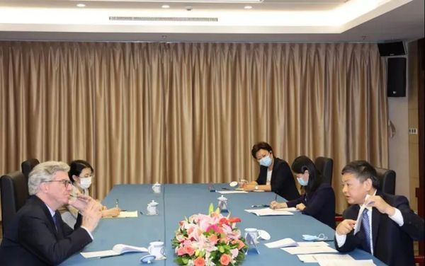 ▎2021年8月23日,生态环境部部长黄润秋会见美国布鲁金斯学会名誉主席约翰·桑顿。图源:生态环境部官方微博