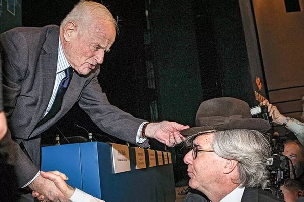 ▎巴里克黄金公司的Peter Munk(左)在董事会成员的年度股东大会结束后将他的标志性帽子戴在了董事会成员约翰·桑顿(John L. Thornton)的头上。图源:Canadian Business