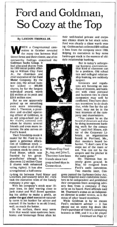 ▎2002年12月8日,《纽约时报》发文称比尔·福特(William Clay Ford, Jr.)在高盛1999年的首次公开募股中获得400,000股股票时,福特和桑顿的个人关系受到了“严格审查”。图源:The New York Times