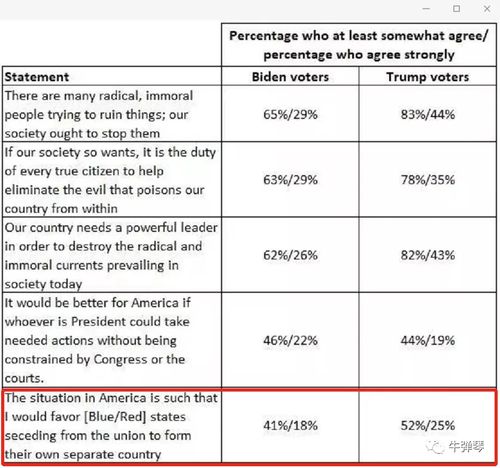超过一半(52%)的特朗普支持者,和41%的拜登支持者,都认为美国现在分裂会更好一些,你们蓝州成为一个国家,红州成为另一个国家。