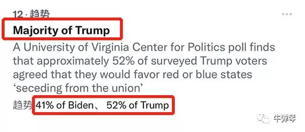 看了一下,几个关键词:特朗普的大多数、52%的特朗普支持者、41%的拜登支持者,都上了推特热搜,而且居高不下。